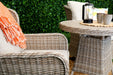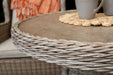The set includes four beautifully woven armchairs crafted from durable natural sandstone rattan, offering a classic look that complements a wide range of outdoor settings. Each chair features supportive high backs and plush, comfortable cushions that provide excellent support, allowing you and your guests to sit back and enjoy long, leisurely meals outdoors.